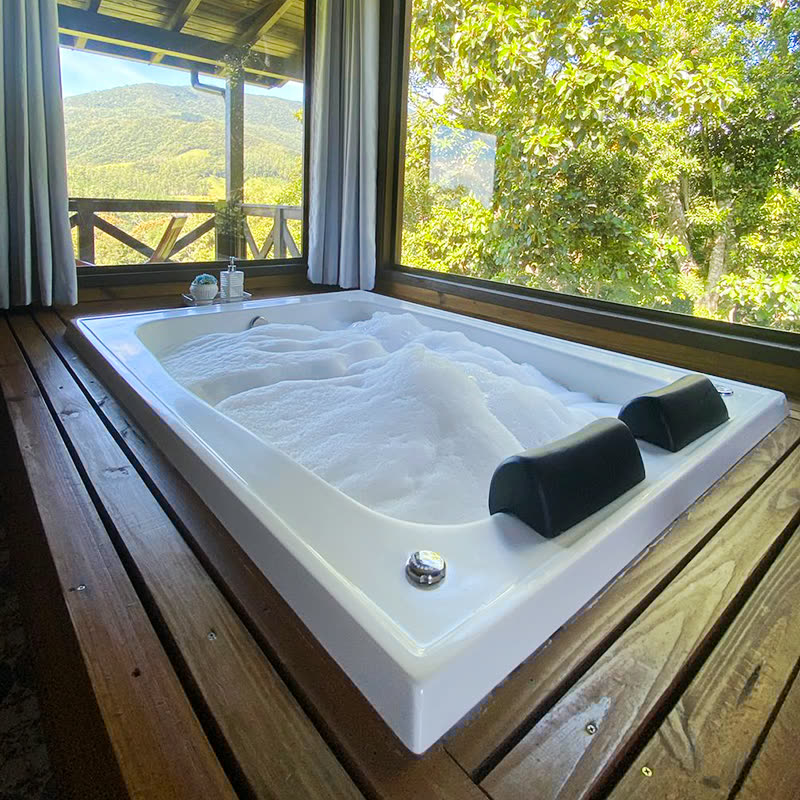 Design ergonômico para dois, proporcionando conforto durante o banho compartilhado